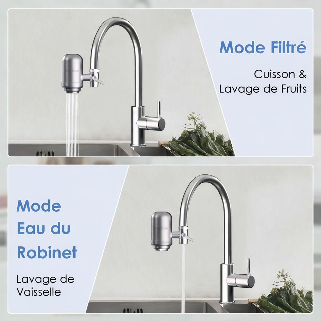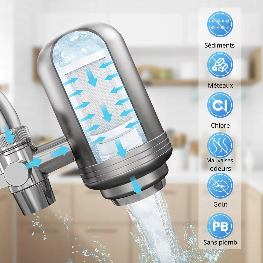 Notre filtre à eau nouvelle génération se fixe en quelques minutes et agit là où tout commence : à la sortie de votre robinet.
